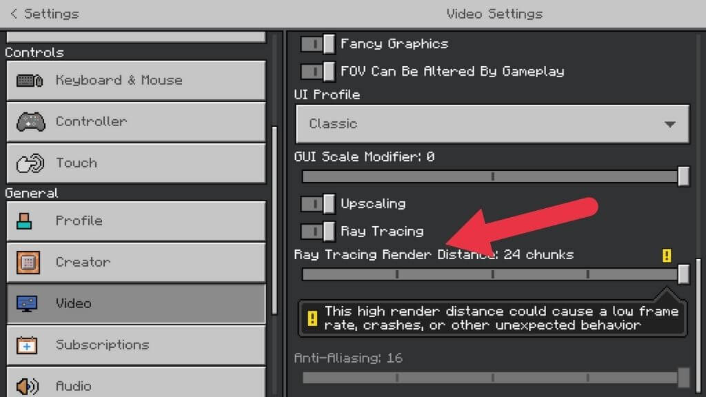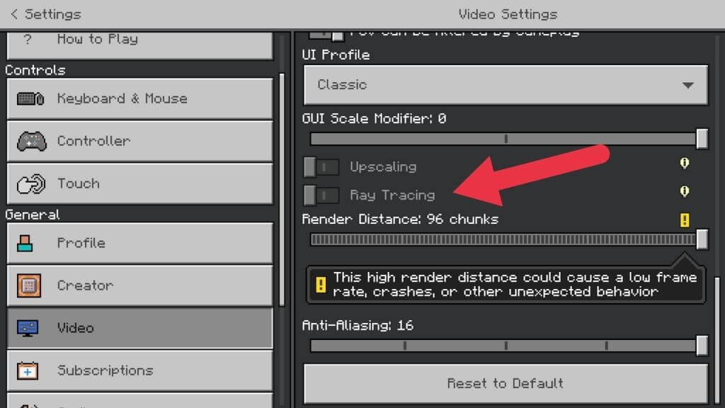 如果遊戲看起來仍然像普通的 Minecraft,請返回主菜單。然後選擇設定>影片並切換光線追踪開關至開啟位置。當遊戲世界重新渲染時,您的屏幕可能會短暫閃爍。