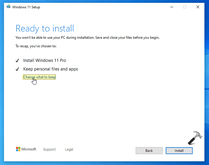 11.最後,您將看到“準備安裝”屏幕。點擊改變要保留的內容鏈接在那裡。