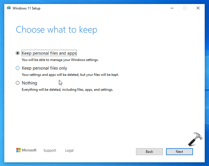 12.在選擇保留內容上,您可以選擇是否要保留文件和應用程序等數據。這裡要小心,不要選擇Nothing,因為升級後它將刪除所有內容並且不會保留任何數據。點擊下一個。