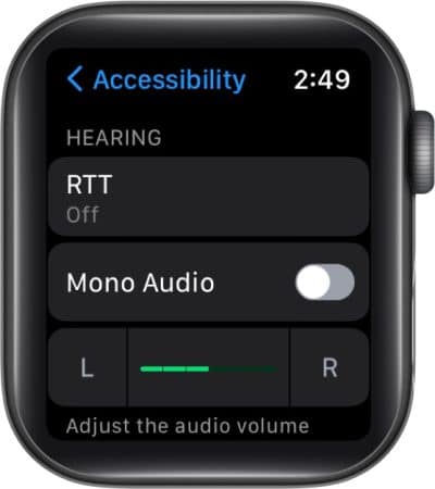或者,您可以在 iPhone 上啟動 Apple Watch 應用,輕點我的手錶→ 點擊無障礙→ 打開/關閉單聲道音頻,或調整音頻平衡。