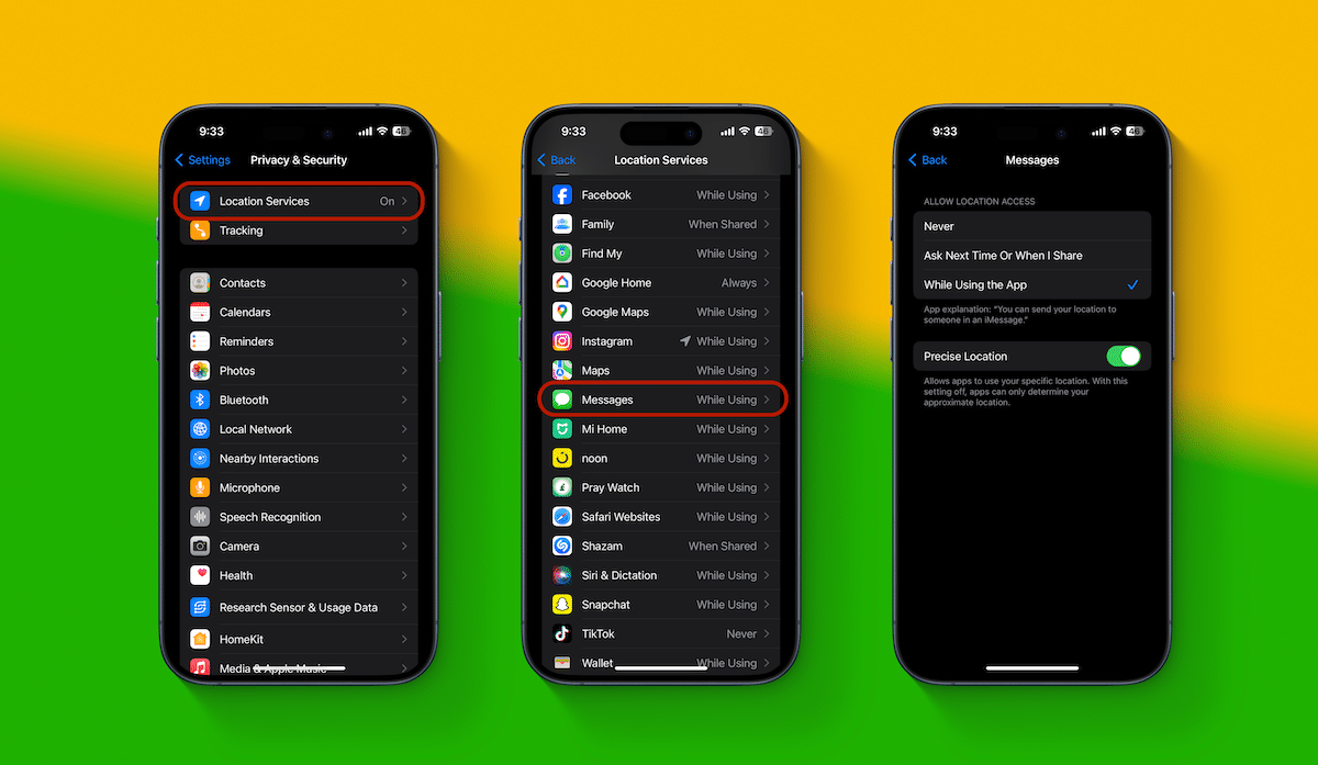 要使用“簽入”功能,發送者和接收者必須使用 iOS 17 或更高版本,並通過“設置”應用 >“隱私和安全”>“位置服務”>“消息”打開位置共享。