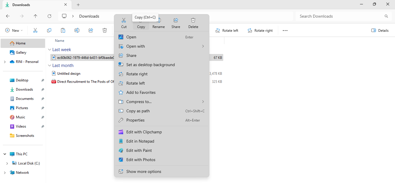步驟2-接下來,右鍵單擊文件/文件夾,然後從上下文菜單中選擇複製選項。除此之外,選擇文件/文件夾並鍵入 Ctrl + C 或按功能區中的“複製”也將復制所選文件/文件夾。