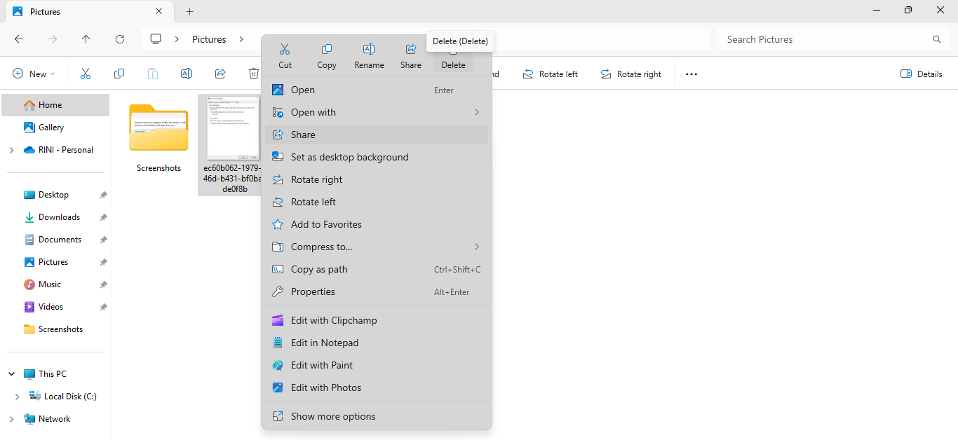 步驟2-最後,右鍵單擊文件/文件夾,然後按刪除。此外,選擇文件並按刪除鍵或在功能區中選擇刪除也會將其刪除。