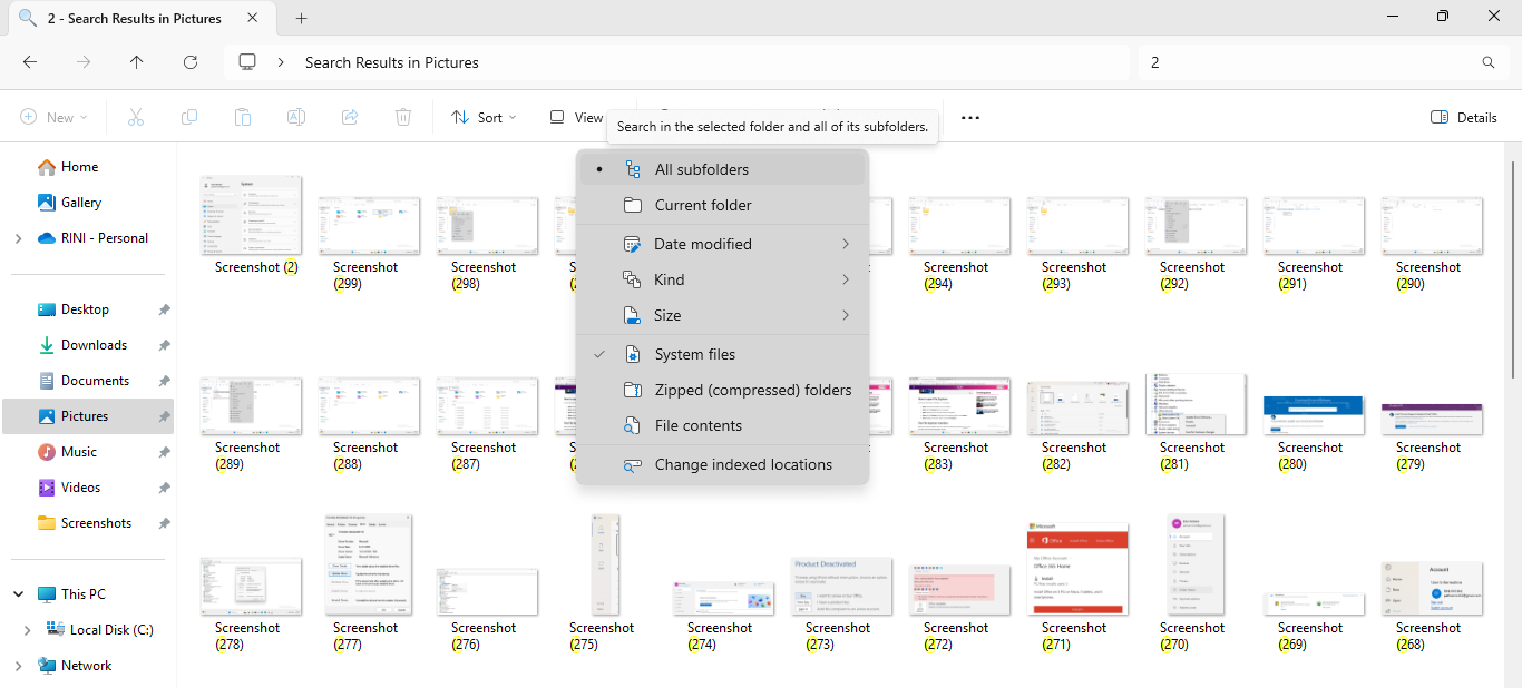 文件資源管理器的用戶可以通過在搜索中添加其他過濾器來優化搜索。讓我們看看如何做同樣的事情 -