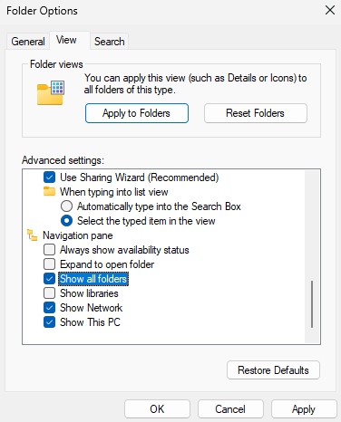 步驟2-接下來,切換到“查看”選項卡,然後單擊“顯示下面的所有文件夾”。