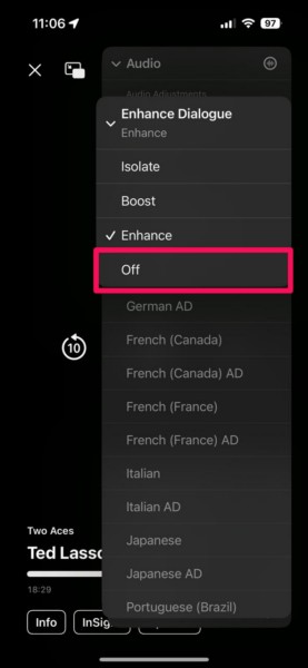 6.如果您想稍後禁用增強對話功能,打開音頻設置在播放器內和選擇關閉選項根據增強對話部分。