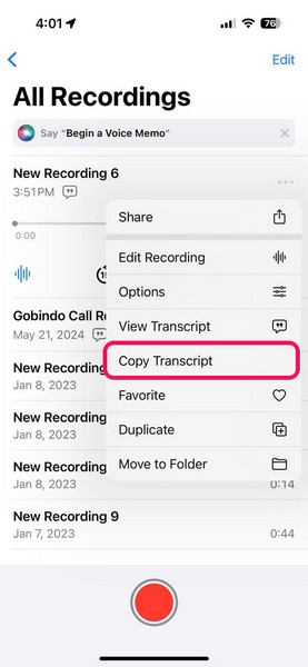 就像您在“筆記”應用程序中使用附加音頻轉錄功能一樣,您也可以在“語音備忘錄”應用程序中利用該功能。請按照下面的步驟了解如何執行此操作: