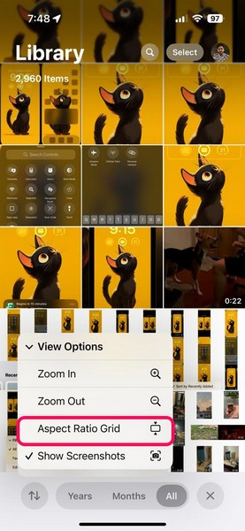 因此,在 iOS 18 中,您可以使用“視圖選項”菜單下的功能來隱藏屏幕截圖,還可以更改 iPhone 上照片庫的整個視圖。