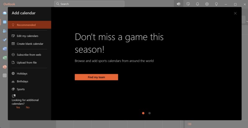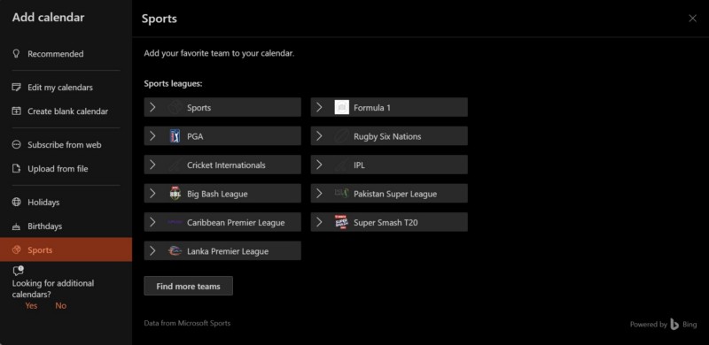 除此之外,您還可以添加日曆假期,生日, 和運動的來自右側窗格中的專用部分的事件。因此,當我們提到您可以添加專用日曆來跟踪您最喜歡的運動隊的日程安排時,我們並不是在開玩笑,因為您可以從“運動”選項中輕鬆添加任何運動隊的官方日程日曆。