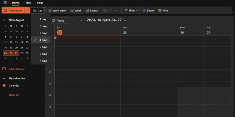 對於日視圖選項,您可以單擊旁邊的向下箭頭打開下拉菜單,然後選擇一次要查看的天數。選項範圍從 1 到 7。因此,如果您選擇 4 天,日曆應用程序將顯示接下來 4 天的事件,包括當天。