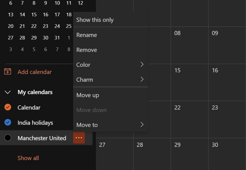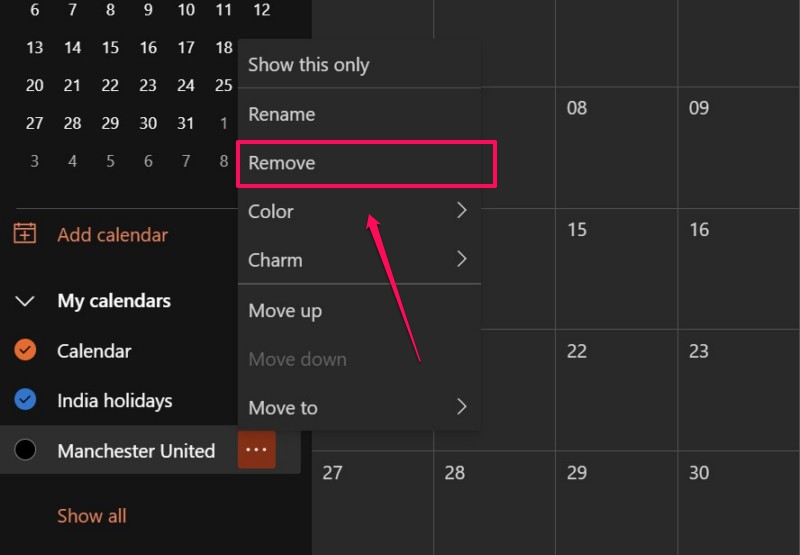 如果您想要從“我的日曆”列表中刪除選定的日曆,並從 Windows 11 電腦或筆記本電腦上的日曆應用程序中刪除其數據,您可以單擊刪除按鈕在上下文菜單上。