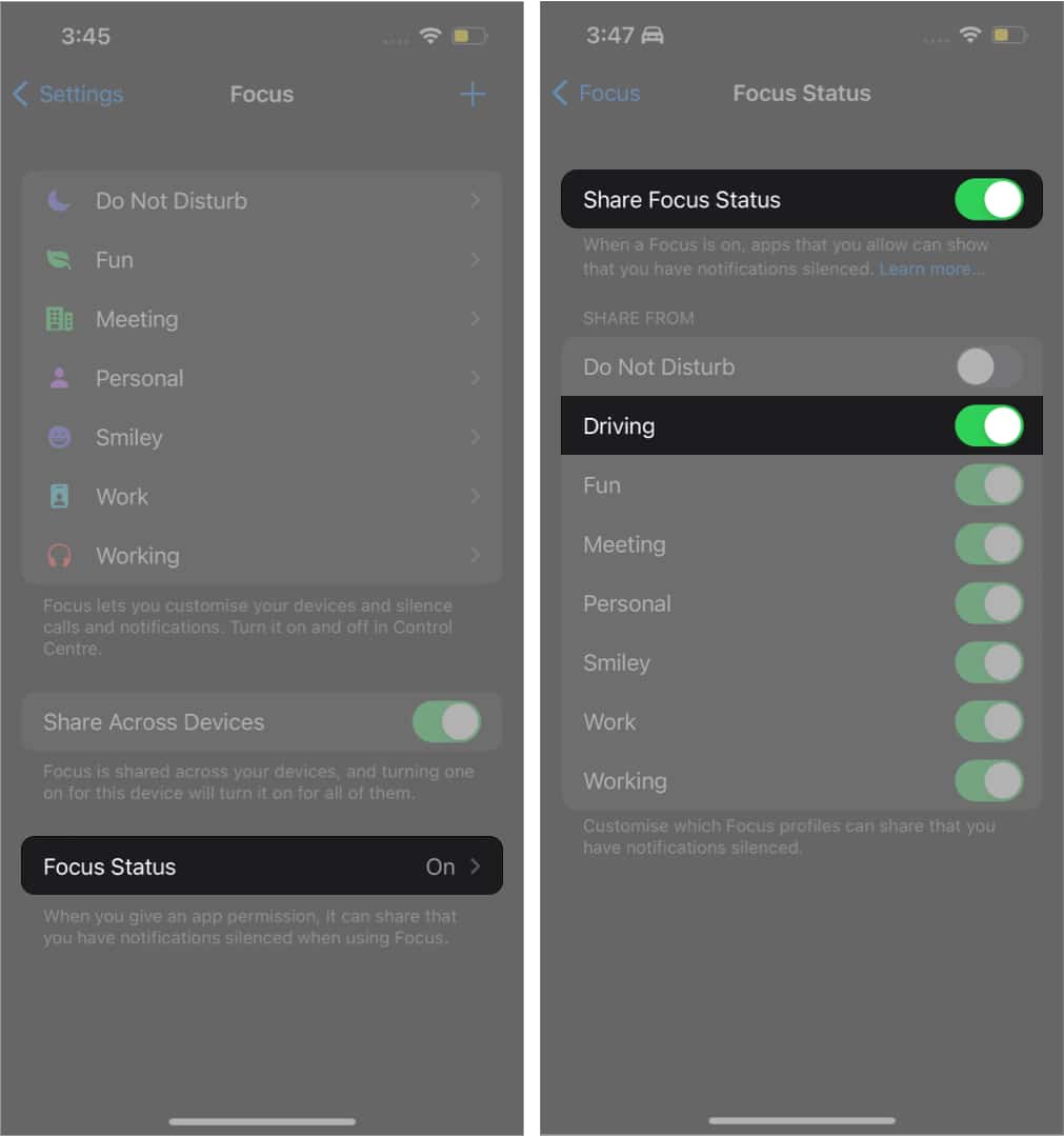 在 iOS 15 中:前往設定→重點→駕駛 →焦點狀態 →開啟分享焦點狀態。