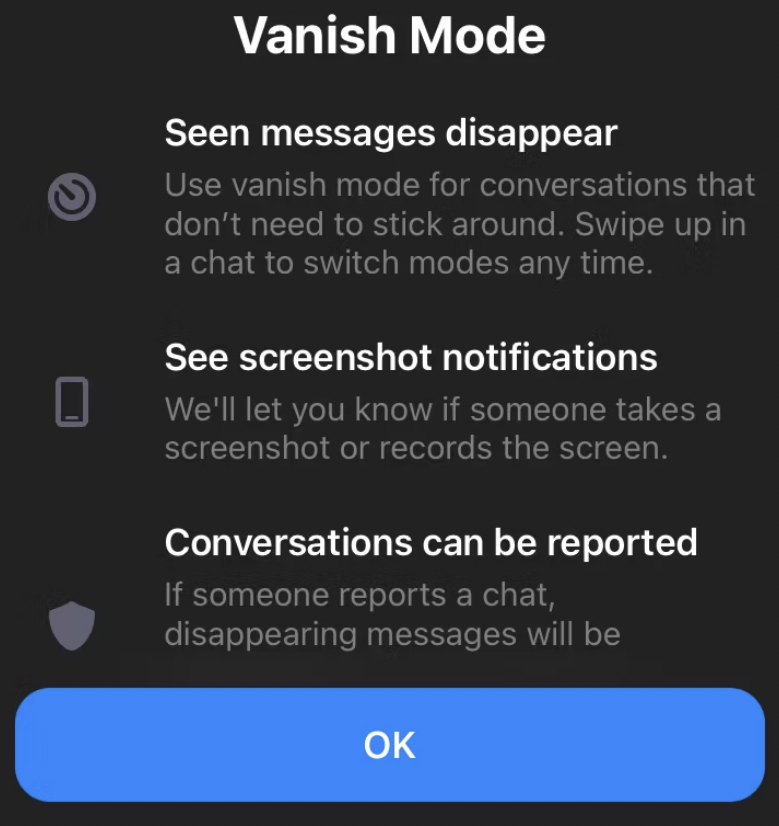 如果這是您第一次使用消失模式,您還會看到一個彈出窗口,其中包含有關該功能如何工作的基本信息。退出聊天或關閉消失模式後,您在消失模式下發送的所有消息都將消失。
