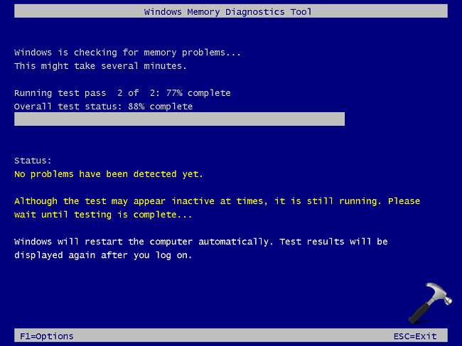 3.現在您的計算機將自行重新啟動,您將看到如下所示的屏幕。Windows內存診斷將執行兩次內存測試。完成後,計算機會自行重新啟動,以便您可以登錄並獲取測試結果。