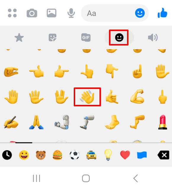 - 表情符號菜單將打開。向下滾動直到找到海浪圖標(由揮舞的手錶示),然後點擊它。
