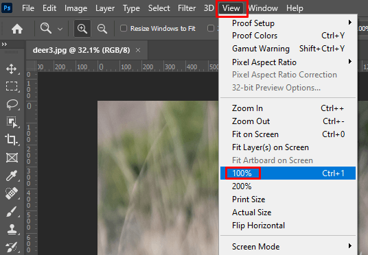 每當您想要獲得最準確的圖像視圖時,您應該以 100% 縮放的方式查看它。這是因為,在 100% 時,一個監視器像素將顯示一個圖像像素。要快速跳轉到 100% 視圖,您可以從功能區上的“視圖”菜單中選擇它。只需從下拉菜單中選擇 100% 選項即可。