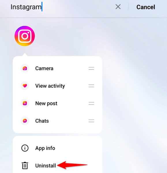 - 點擊並按住Instagram在您的應用程序抽屜中並選擇解除安裝。