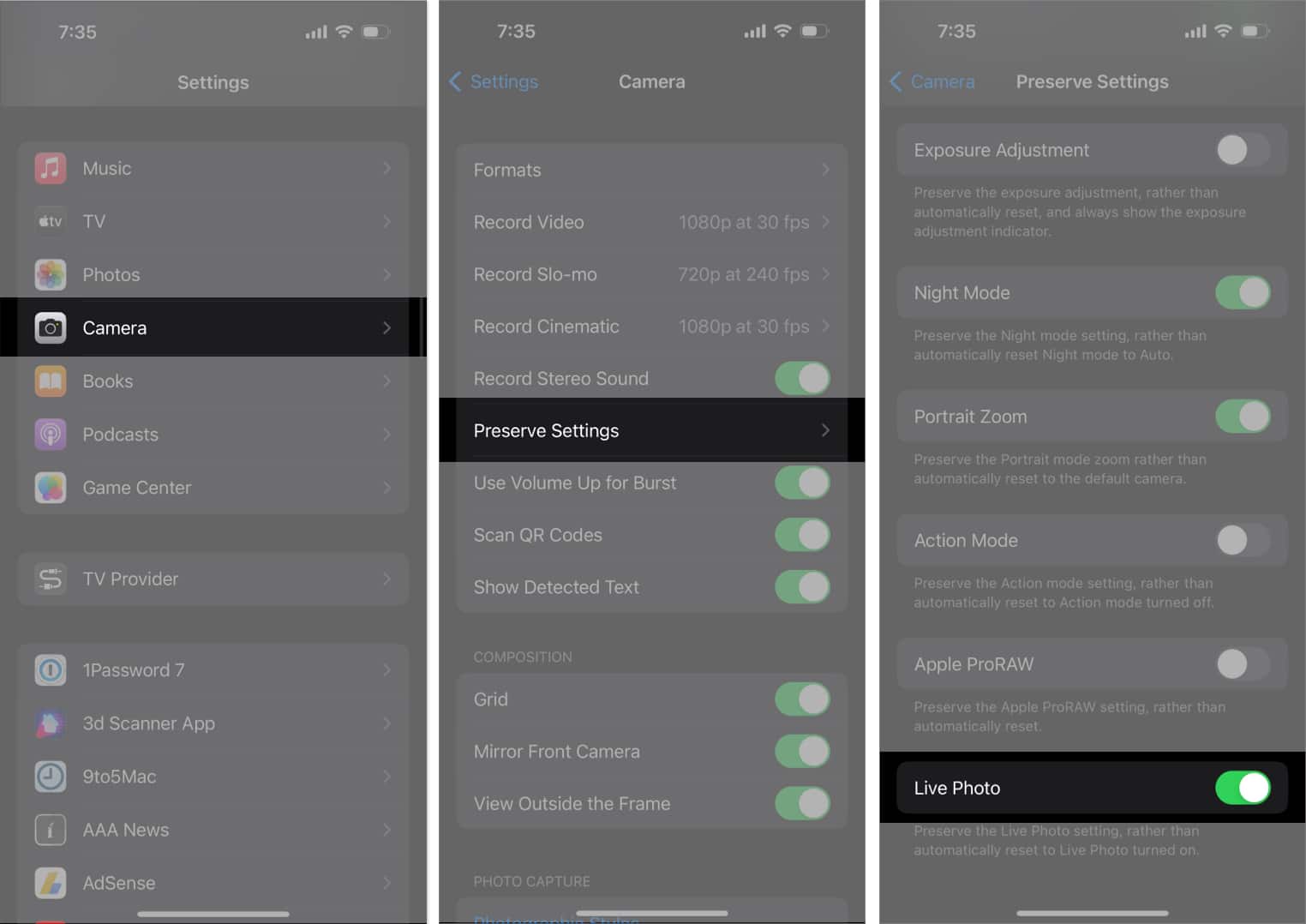 它將關閉實時照片,直到您關閉相機。如果您想永久禁用實時照片,請轉至設置 → 相機 → 保留設置→ 打開現場照片。