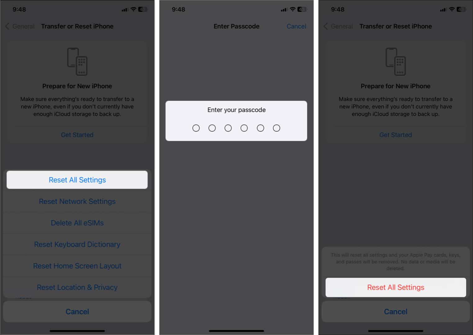 要重置 iPhone 設置,請打開設定。然後,前往一般的→轉移或重置 iPhone→重置→重置所有設置。現在,輸入您的 iPhone 密碼並點擊重置所有設置確認您的選擇。