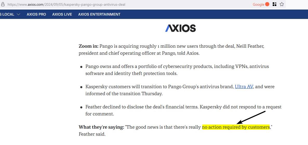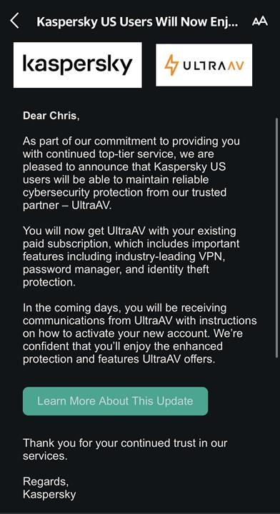 事實證明他們做到了,阿克西奧斯兩週前寫過這個。用戶通過電子郵件收到有關從卡巴斯基遷移到 UltraAV 的通知。但也有一些用戶表示從未通知過在安裝軟件之前。