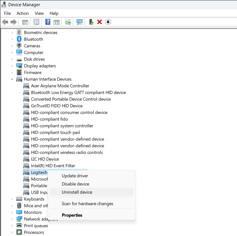 另一個可能的問題是損壞Logitech無線適配器驅動程序。通過設備管理器刪除並重新安裝了關聯的驅動程序文件,以排除該文件。以下是: