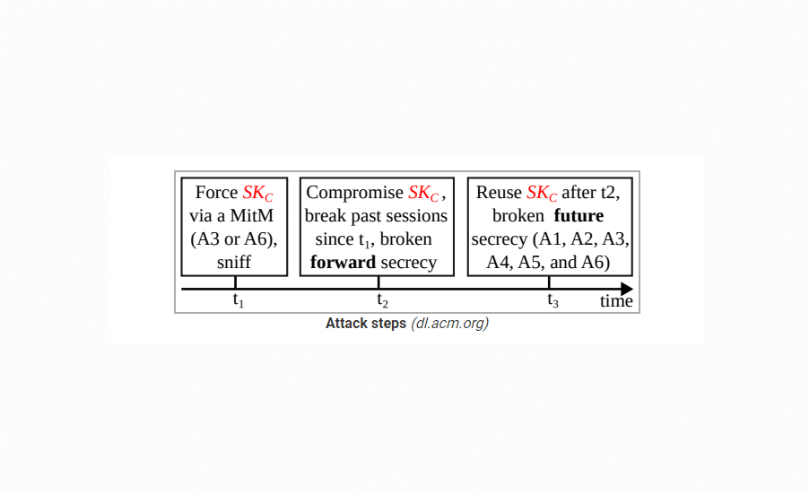 BLUFFS 利用會話密鑰派生過程強制生成弱且可預測的會話密鑰。然後,攻擊者可以暴力破解該密鑰,從而使他們能夠解密過去的通信並操縱未來的通信。攻擊場景假設攻擊者位於兩個受害設備的藍牙範圍內,允許他們以明文捕獲數據包、協商弱會話密鑰以及向另一台設備冒充一台設備。