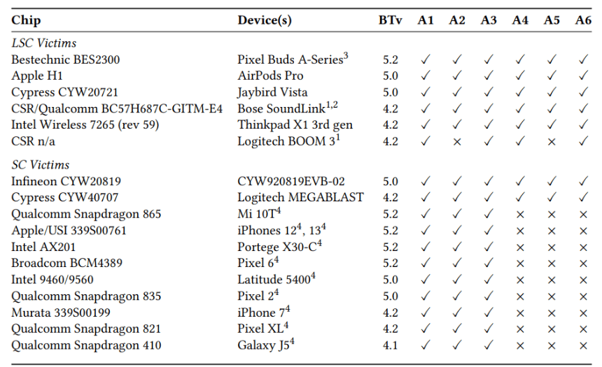 藍牙技術的廣泛採用,加上這些漏洞的架構級別,引起了整個藍牙生態系統的嚴重擔憂。 EURECOM 研究人員針對 17 種不同的藍牙芯片測試了 BLUFFS,發現所有設備都容易受到攻擊。這種影響延伸到了大量設備,包括智能手機、耳機、筆記本電腦等。