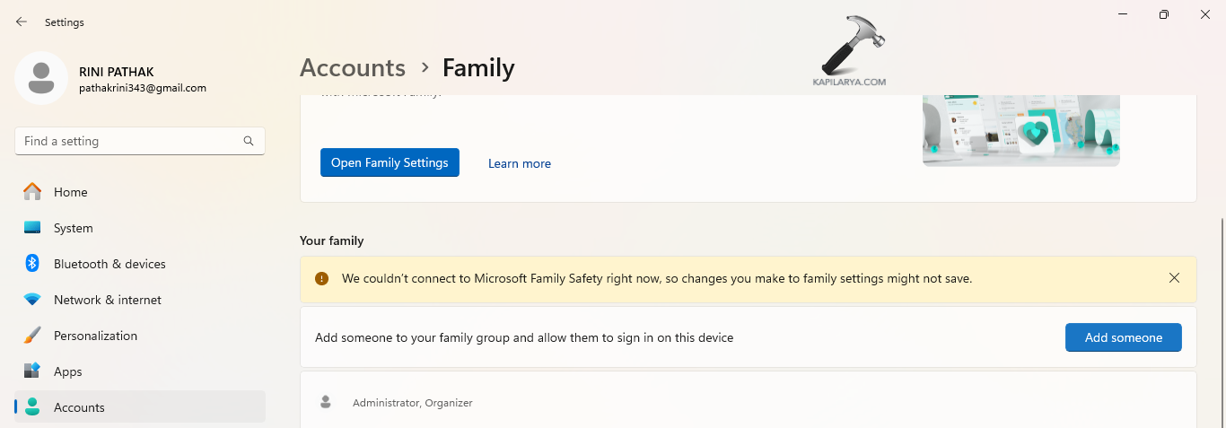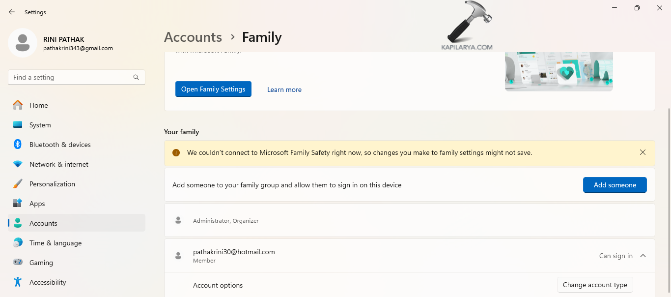 步驟 6-再次轉到“帳戶”>“家庭和其他用戶”。然後,選擇新帳戶並選擇更改帳戶類型。