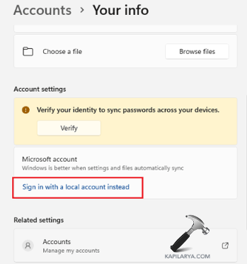 步驟2-現在,在“帳戶設置”下方選擇“您的信息”>“使用本地帳戶登錄”。