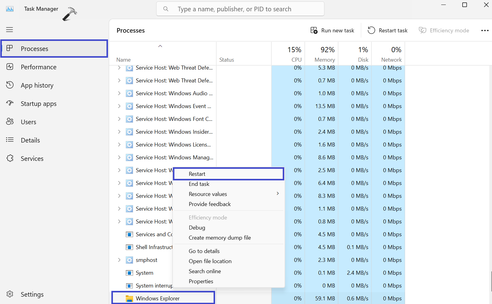3. 現在,右鍵單擊Windows資源管理器然後點擊“重新啟動”選項。