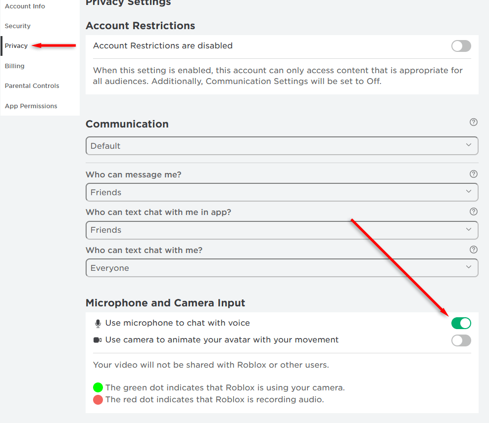 - 檢查 Roblox 中是否啟用了語音聊天。在您的設備上打開 Roblox,無論是 PC、Xbox、Android 還是 iPhone。選擇齒輪圖標屏幕右上角(靠近您的 Roblox 帳戶圖標)並選擇設定從下拉菜單中。打開隱私選項卡並確保使用麥克風進行語音聊天已打開。