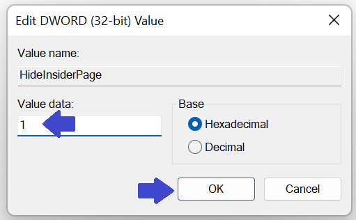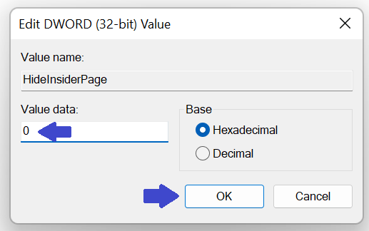 步驟3:創建註冊表項後,雙擊隱藏內幕頁面並將數值數據從 0 更改為 1。