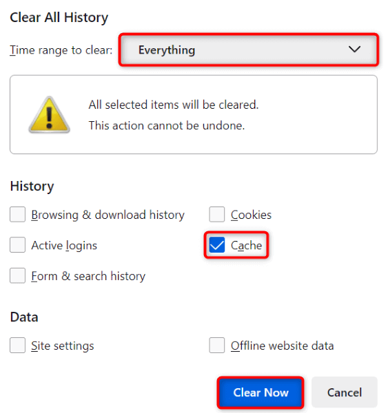 - 選擇一切在清除時間範圍下拉菜單,啟用快取選項,禁用所有其他選項,然後選擇立即清除。