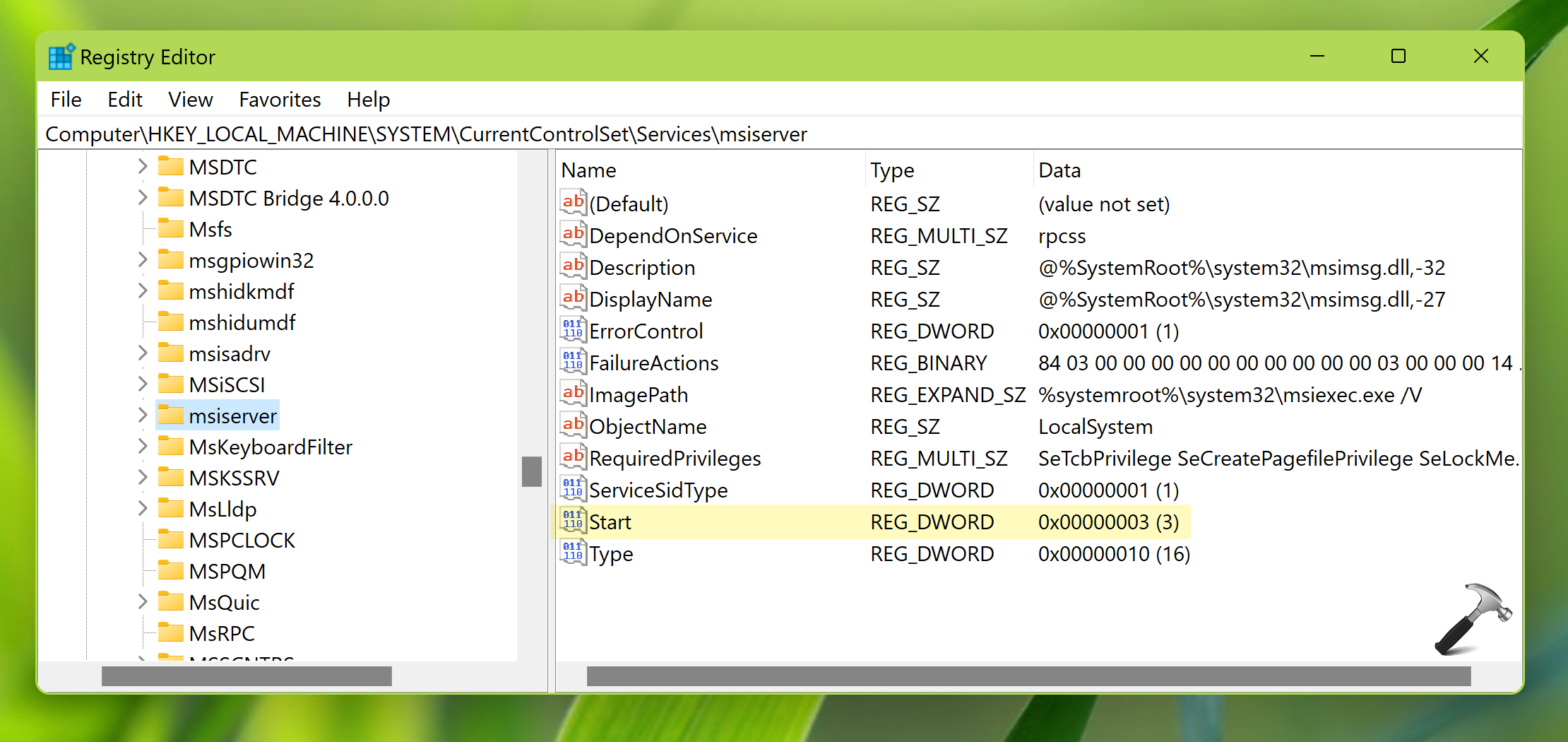 3. 在 msiserver 註冊表項下,您會發現開始註冊表 DWORD (REG_DWORD)。雙擊該註冊表DWORD可修改其值數據。
