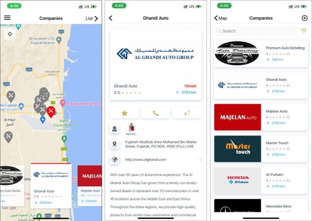 您可以從選項列表(按評級排序)中選擇附近最適合您偏好的公司。選擇該公司時會列出其詳細信息以及所有聯繫信息、路線、距離,甚至 Instagram 賬號(如果有的話)。