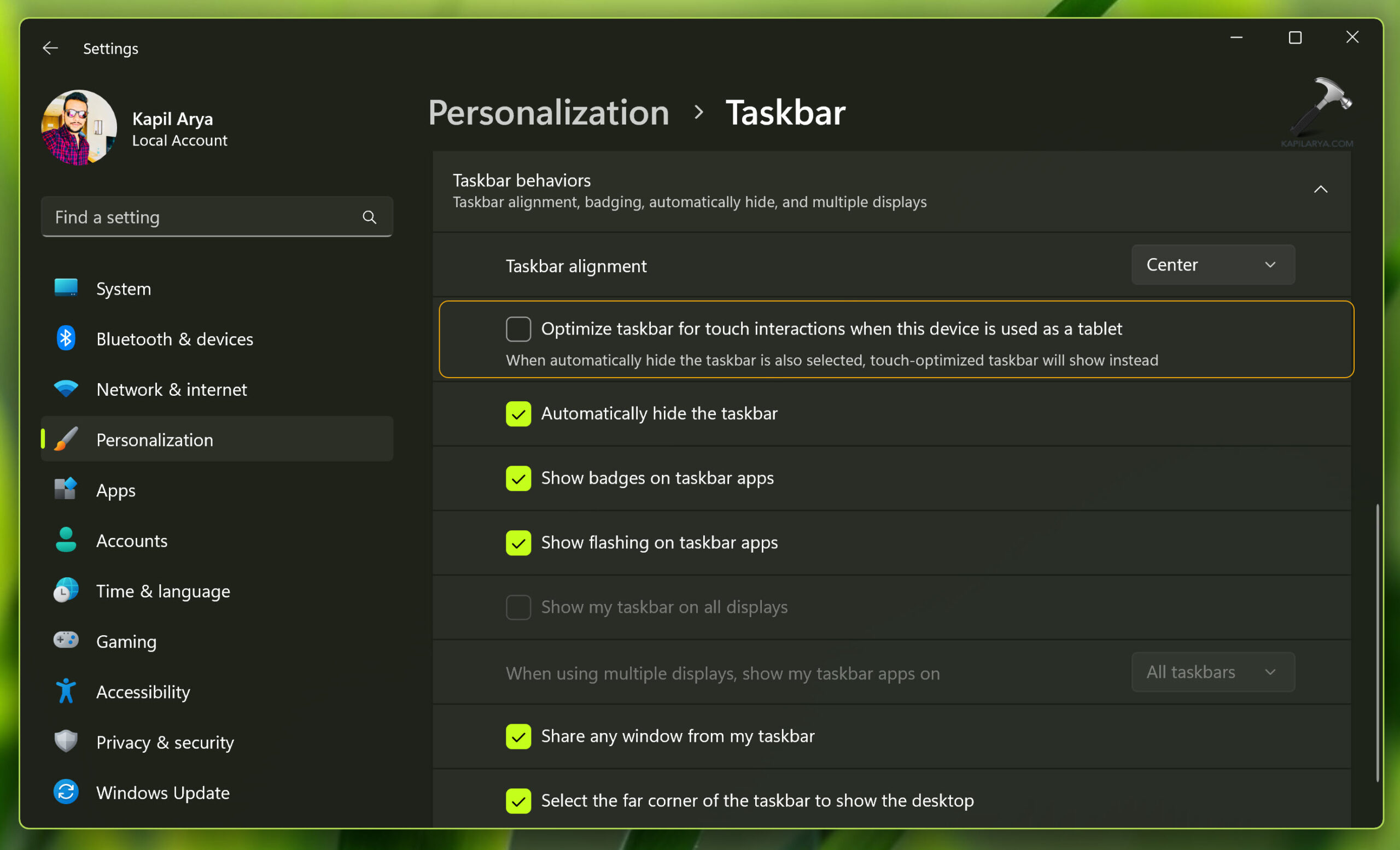 3.在任務欄下,確保當此設備用作平板電腦時,優化任務欄以實現觸摸交互被轉動離開或者未經檢查的。即使您已選中自動隱藏任務欄,您也會看到觸摸優化的任務欄。