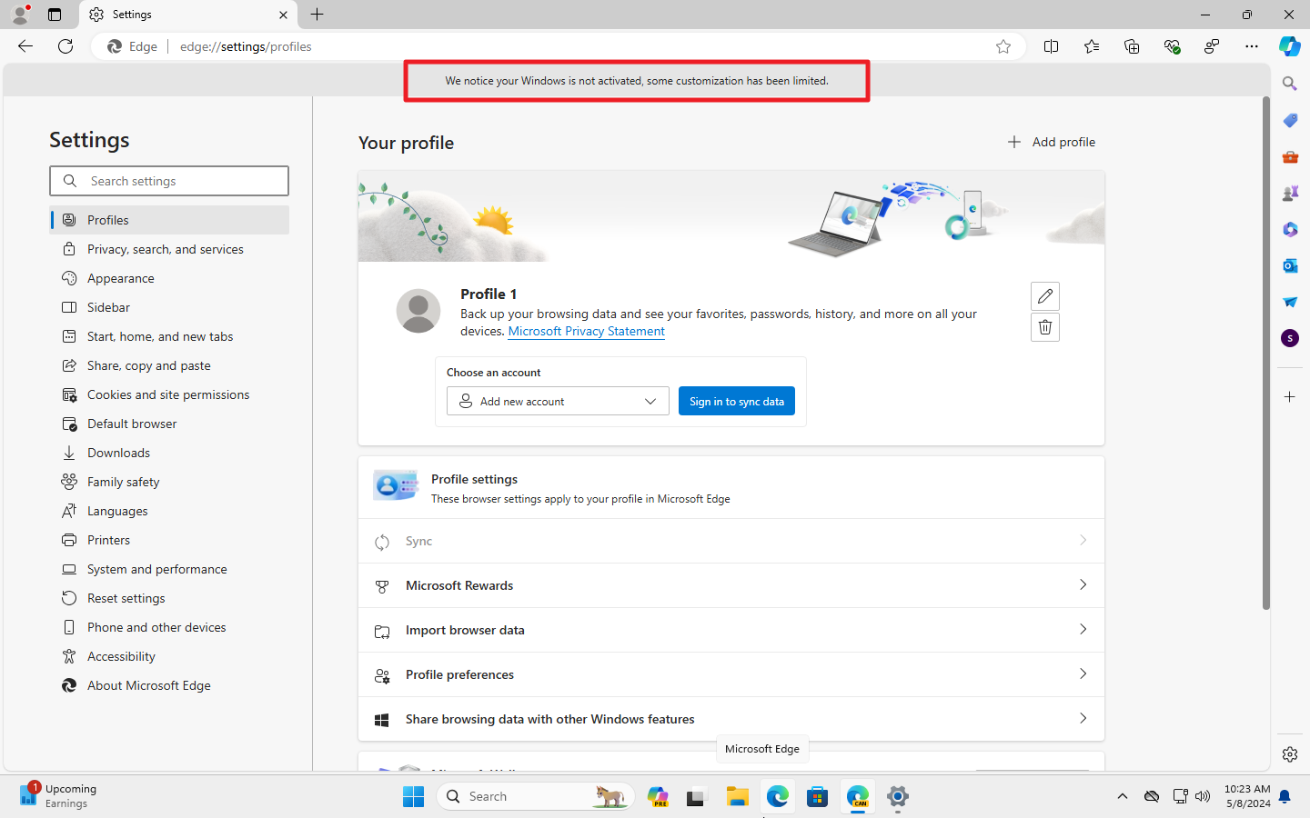 啟用後,Edge 在未激活的系統上的“設置”中顯示以下消息:“我們注意到您的 Windows 未激活,某些自定義已受到限制”。