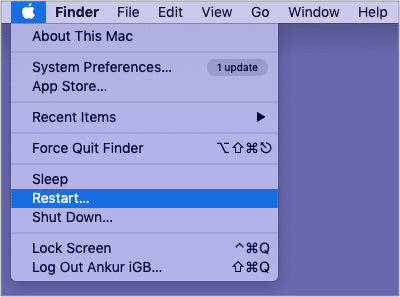 有時,Mac 的 USB 端口可能會由於隨機的小故障而無法工作。您可以通過單擊快速解決此問題蘋果標誌在左上角並選擇重新啟動。