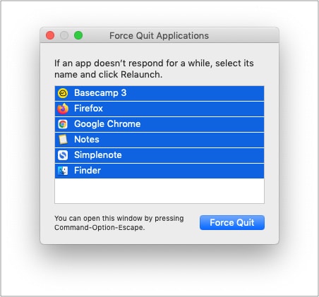 或者(在所有應用程序中保存正在進行的工作後),您可以按命令+選項+esc帶來強制退出菜單。現在,按命令+A選擇所有內容並單擊強制退出。之後,等待幾秒鐘,查看驅動器是否顯示。