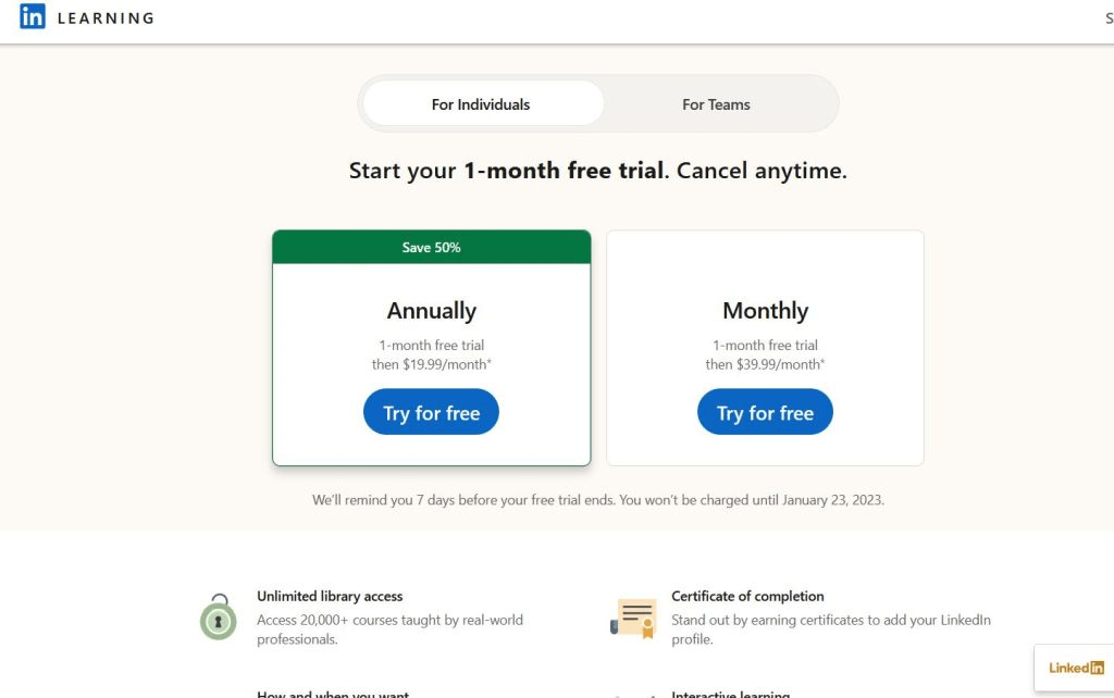 要使用 Linkedin 學習,您需要一個 Linkedin 帳戶。如果您沒有,您可以在 Linkedin 學習網站上創建一個。接下來,選擇開始我的免費月並決定您是否需要按年或按月訂閱。