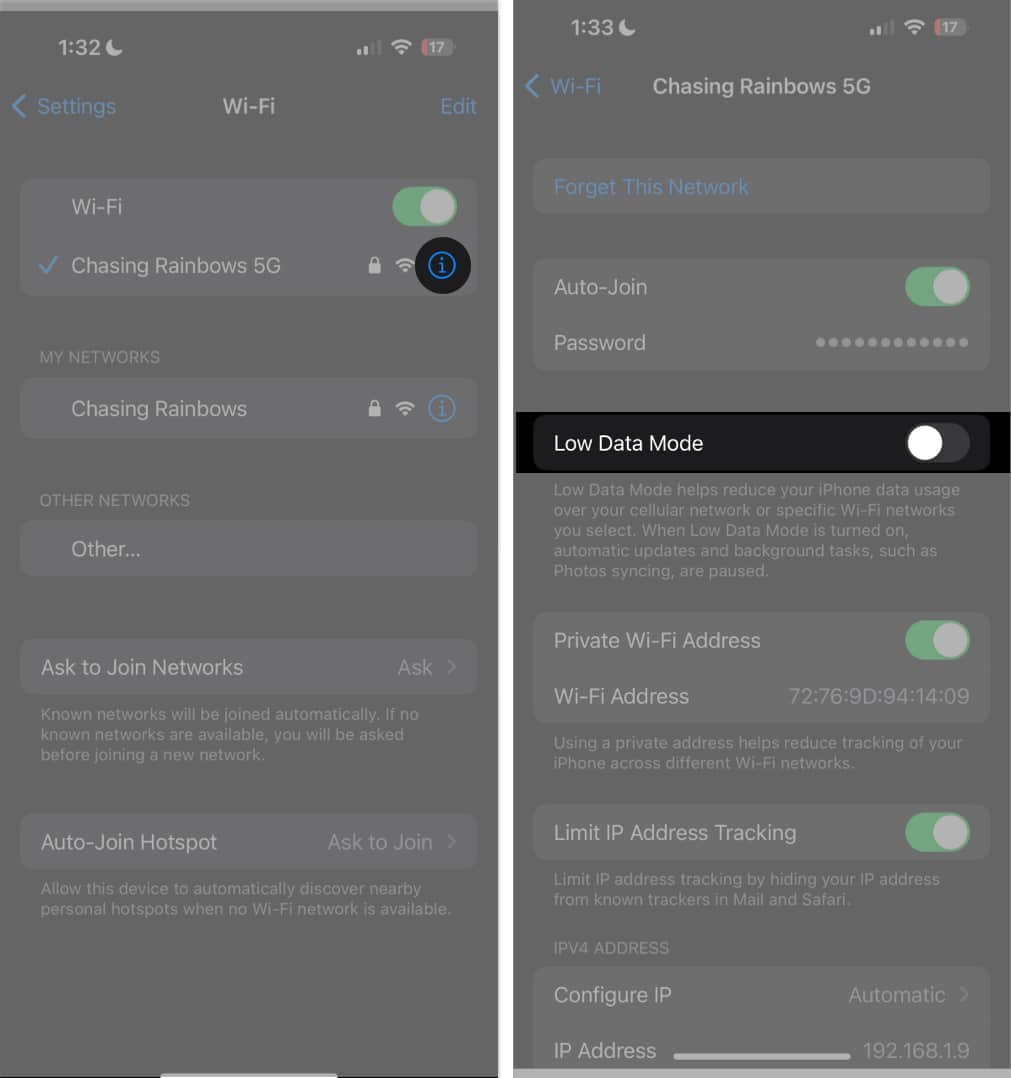要檢查,請訪問無線上網→ 點擊信息 (i) 按鈕→ 關閉低數據模式如果它已打開。