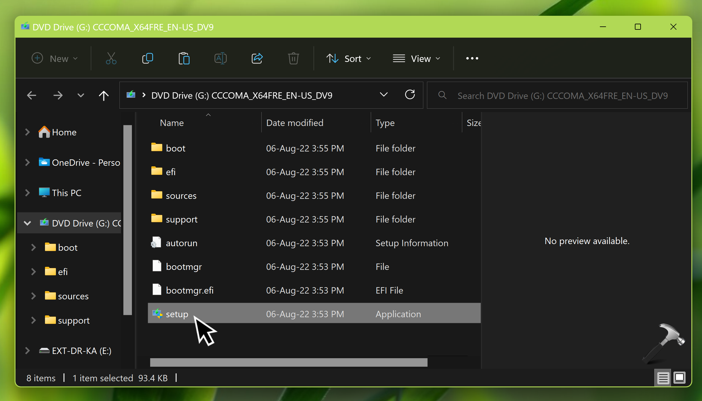 下載 ISO 文件後,您只需雙擊它並將其安裝到 DVD 驅動器即可。然後轉到已安裝的 DVD 驅動器並雙擊setup.exe文件以啟動 Windows 11 25H2 的安裝程序。