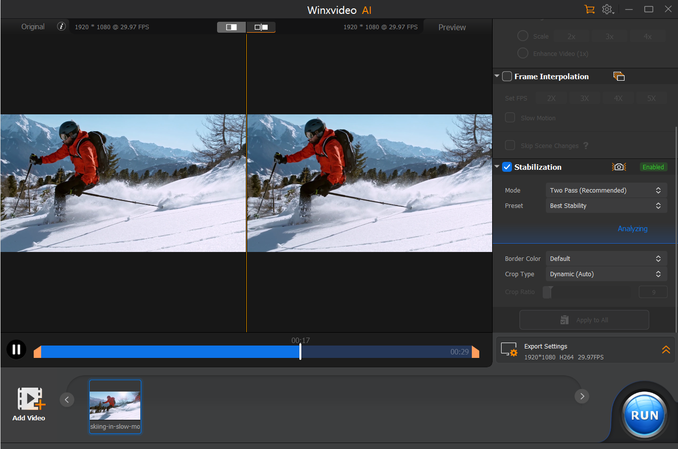 對於那些尋求更流暢視頻播放的人來說,Winxvideo AI 提供了 AI 幀插值。這項創新技術分析現有視頻幀並生成新的中間幀。這有效地提高了視頻的幀速率 (fps),從而帶來更加流暢和自然的觀看體驗,特別是對於快速移動的動作序列。