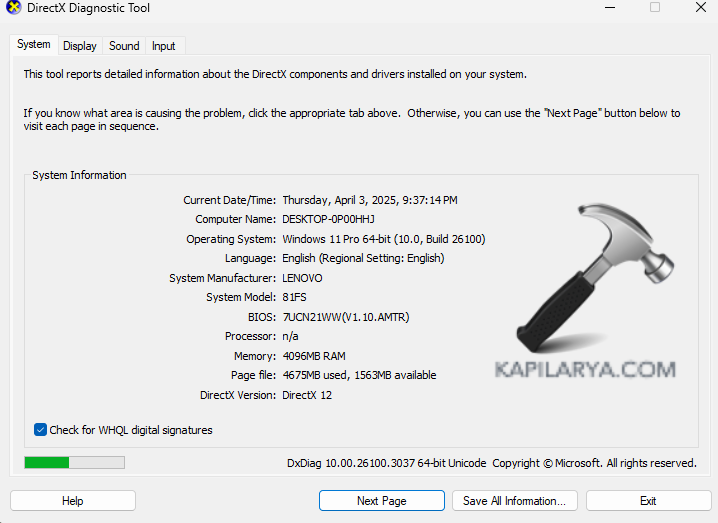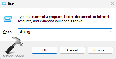 步驟2-現在,編寫下面給出的命令並單擊 Enter。它將打開 DirectX 診斷工具。